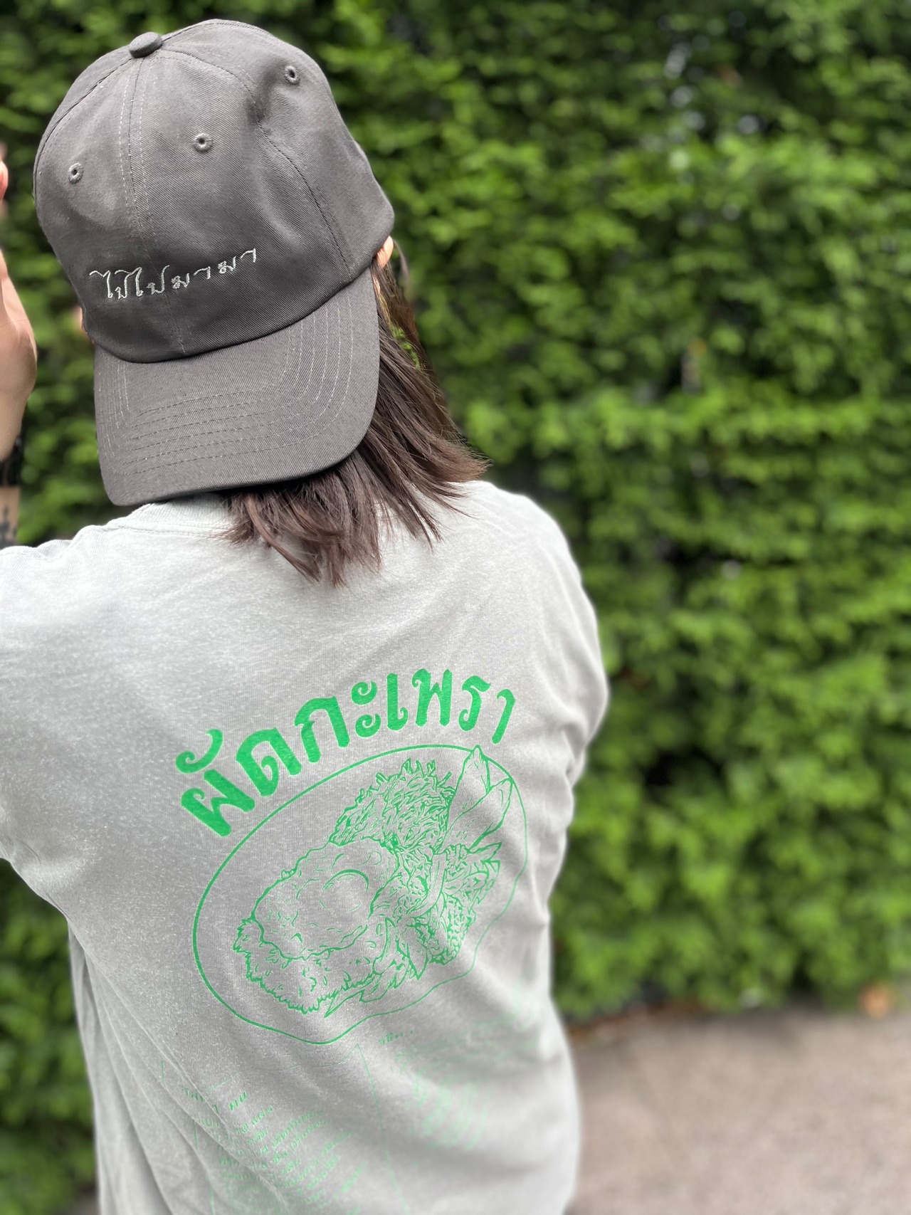 • バック: タイ語で書かれた“ガパオライス”の本格レシピを大胆にプリント